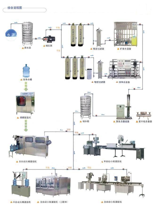 不銹鋼水箱→原水加壓泵→自動多介質過濾器→自動活性炭過濾器→(自動軟水器)→精密過濾器→一級反滲透 →PH調節→純水箱→二級反滲透→無菌純化水箱→純水泵→臭氧系統→紫外線→ 微孔過濾器→用水點
