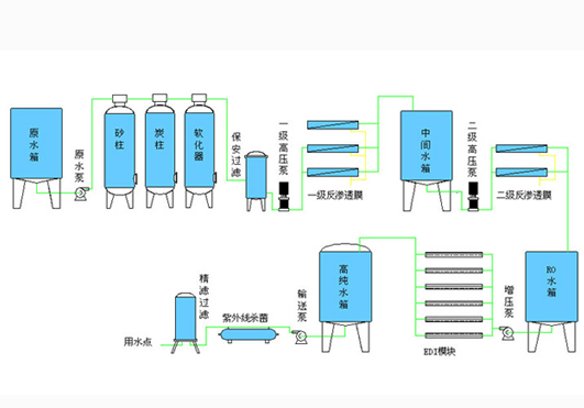 EDI增壓泵 ← 二級純水箱 ← 二級RO主機(jī) ← 一級純水箱 ← 一級RO主機(jī)